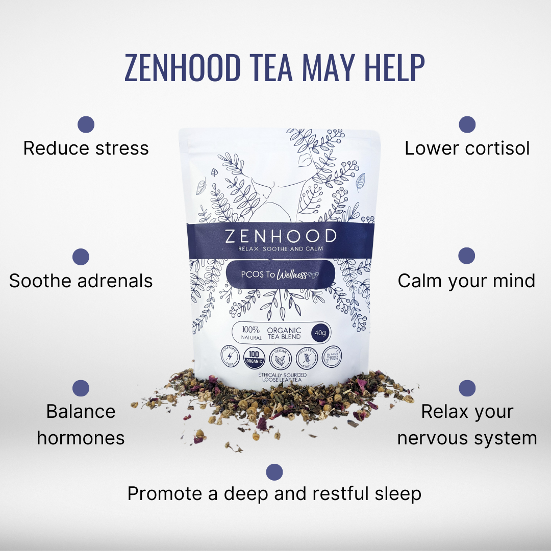 Our Zenhood tea has been specially crafted to help lower cortisol levels and support relaxation for a calm mind and balanced hormones.